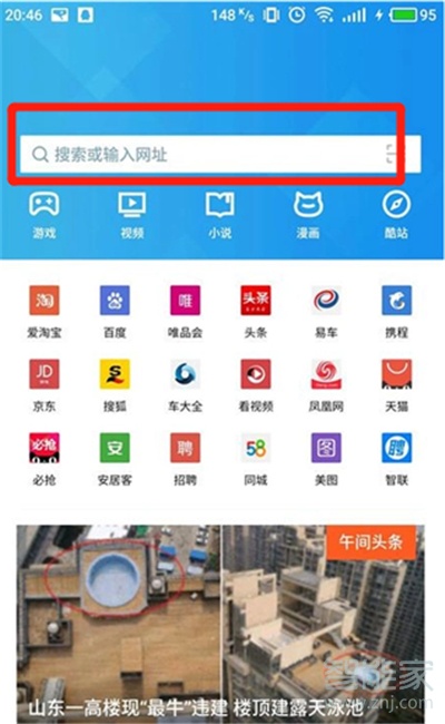 4.打开手机中的浏览器,进入后点击网页搜索栏。