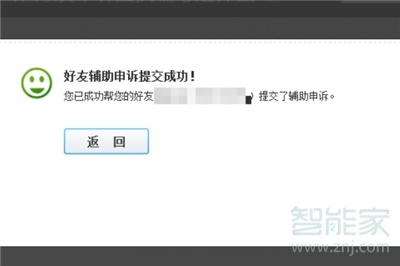 5、确定以后,如果全部都正确的话,我们就会收到好友辅助申诉成功了,我们就可以点击返回了,然后就可以帮好友验证成功了。