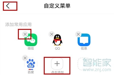 3、然后您可以在菜单中点击应用左上角“×”删除该应用,或者按住应用左右移动,变幻排列顺序。还可以点击“+”号添加其他应用。快捷工具菜单的操作也是如此。然后点击左上角【<】返回。