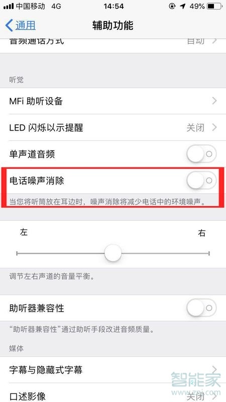 3、打开或关闭”电话噪音消除“,可以提高通话质量,“设置——通用——辅助功能——电话噪音消除”。