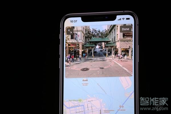 Apple 更新了Apple 地图的显示介面,提供使用者更详细的资讯以及地图模式,新的Apple 地图加入了类似Google 街景模式,可以直接在手机上查看街上的实际画面,也可浏览360 度街景,画面缩放的方式看起来比Google 地图更线性更流畅些,今年预计会开放美国地图,其他国家尚未宣布上路时间。