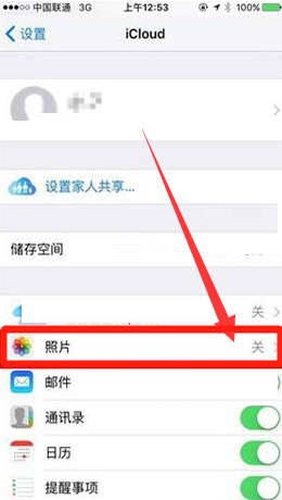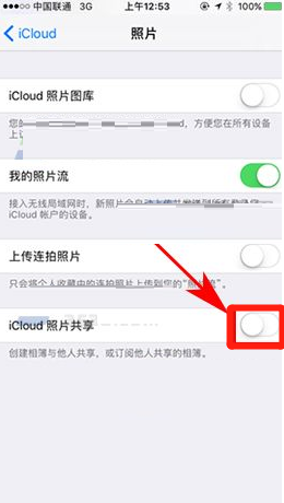 4、进入页面之后,把”iCloud照片共享”右侧的开关关闭。