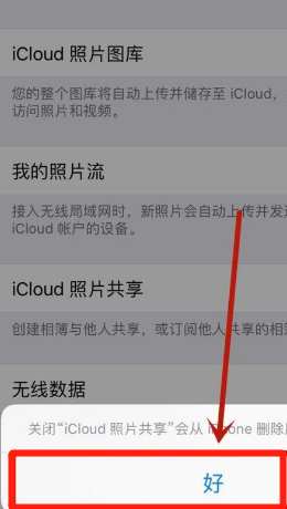 5、接下来会页面上的提示如图,点击“好”选项即可就关掉了照片共享,其他应用的关闭共享方式也和这一样。