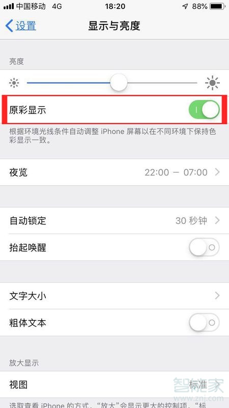3、点击“显示与亮度”页面中“原彩显示”右侧的按钮即可开启该功能。