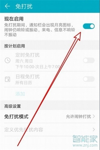 4、接下来在打开的免打扰设置页面中,找到并点击“现在启用” 后面的开关,把其设置为关闭的状态。把开关设置为关闭状态后,我们可以看到在手机屏幕顶部已不显示月亮的图标了。