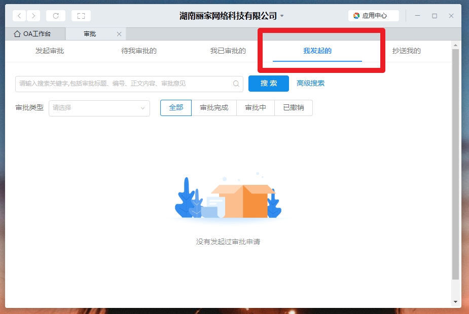6、回到“审批”页面,点击“我发起的”就可以看到你要办理的业务。