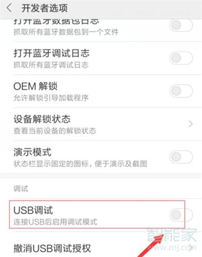 7、在开发者选项的下边开启USB调试功能,或者使用数据线连接电脑的时候弹出来一个菜单点击开启也可以