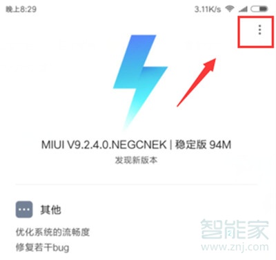第四步:在“MIUI版本”界面,我们点击右上角的三个小圆点。