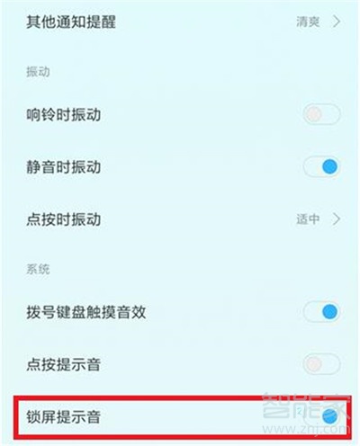 3、找到【锁屏提示音】选项,默认的是打开的,点击后方的开关按钮关闭即可