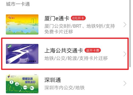 5、选择卡片、因为天宝儿已经把免费的京津冀互联互通卡开通了,所以在这里以上海公共交通卡为例。