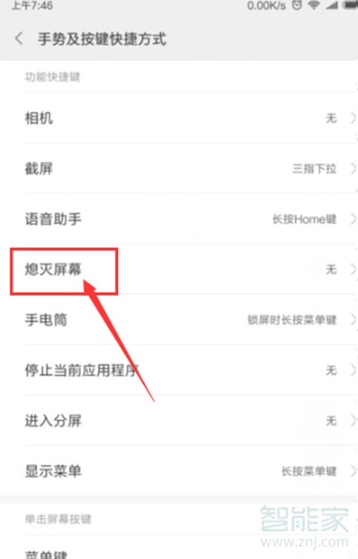 四、进入以后就可以设置各种功能的快捷键,这里以设置”熄灭屏幕“快捷键为例,点击进入。