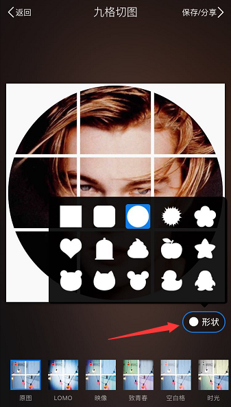 4、打开图片之后可以再编辑页面选择切割的形状和滤镜,选择好之后点击右上角的保存/分享按钮。