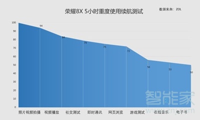 5小时续航测试指:在满电情况下,使用一半的屏幕亮度和音量,清空后台程序,按顺序进行拍照、视频播放、刷微博、使用微信、浏览网页、手机游戏、听音乐以及阅读电子书等操作,并记录每个节点的剩余电量,总共测试时长为5小时。