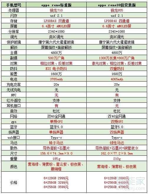 3、处理器性能,reno标准版搭载710处理器,10倍变焦版为骁龙855处理器,在存储和续航方面,10倍变焦版为四通道,标准版为双通道,标准版电池容量为3765毫安,变焦版为4065毫安,此外变焦版还有横向线性马达和铜管液冷散热。