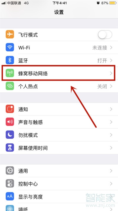 2、进入【设置】的详细选项列表中,选择【蜂窝移动网络】设置。