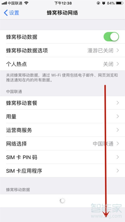 3、在【移动蜂窝网络】的管理设置页面中,按住iphone8手机屏幕中间【向下滑动】至底部。