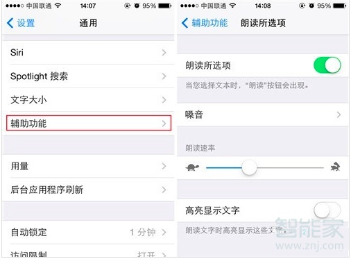 2、进入iPhone通用设置后,再找到“辅助功能”设置选项,并进入,在这里面会找到一个“朗读所选项”设置,我们点击并开启“朗读所选项”功能,然后选择一个合适的朗读速度。