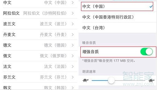 3、iPhone语音功能支持多种语言类型,用户还可以在第二项“嗓音”中选择朗读的语言,基本上世界上比较主流的语言都覆盖了,这里选择的是中文,如下图所示。