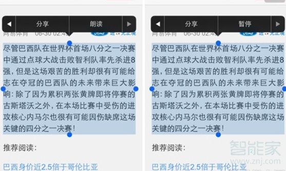 4、开启iPhone文字朗读辅助功能后,可以打开短信或者在浏览器中,找到一篇新闻文章,然后选择需要读取的文字,接下来旁边会有一个朗读按钮,点击后,即可自动听到Siri朗读文字了。