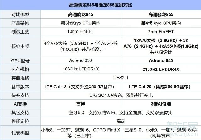 骁龙845基于主流的10nm工艺制程,而骁龙855则升级为了更先进的7nm工艺制程,相比骁龙845,CPU功耗会更低。