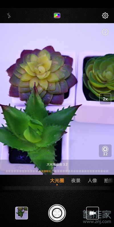 4、大光圈模式可以让背景虚化,前景突出。往左光圈变小背景越模糊,往右光圈越大,背景越清晰。可以根据需要调节。点击屏幕还可以选取对焦位置,出现圆圈,右侧拉杆亮度调节,往上是亮往下是暗