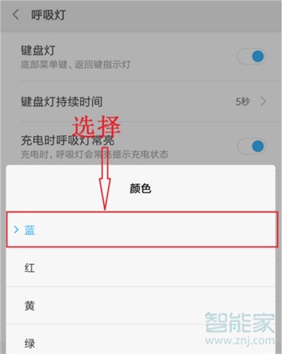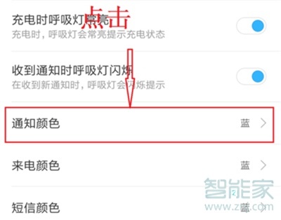 4、在呼吸灯界面中,可以选择通知颜色、来电颜色、短信颜色,可根据个人情况进行配置,我们选择【通知颜色】。