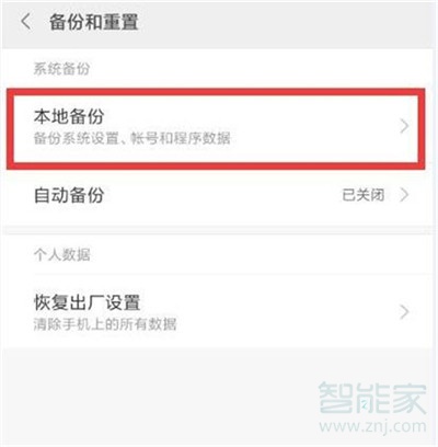 4、进入备份和重置界面后,找到【本地备份】选项点击进入。
