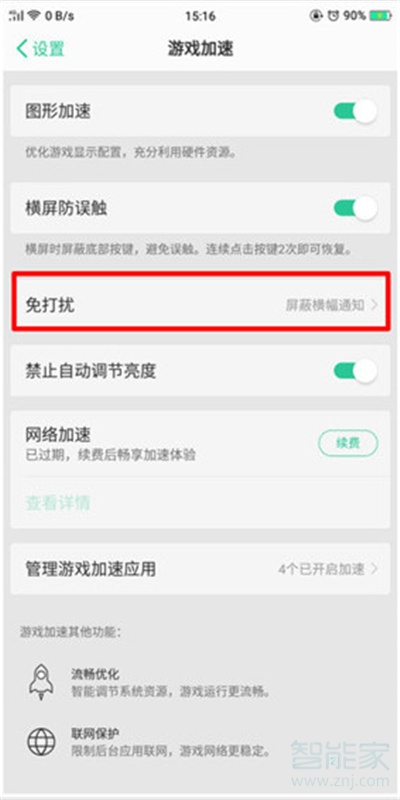 2.然后,先将【横屏防误触】与【禁止自动调节亮度】开启后,找到【免打扰】选项,点击打开。