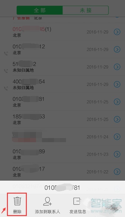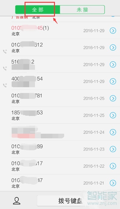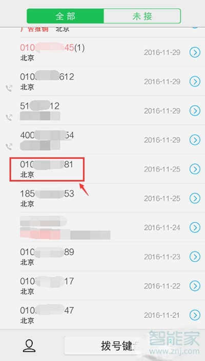第五步,在全部通话记录中,找到要删除的通话记录,长按该通话记录。