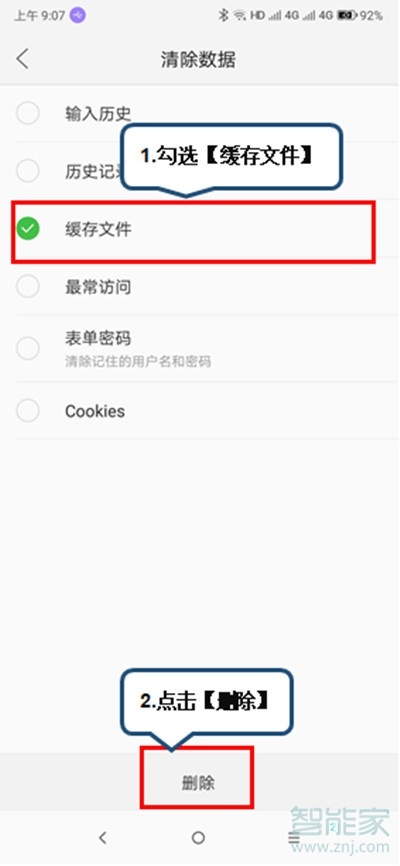 4、勾选【缓存文件】后点击【删除】。