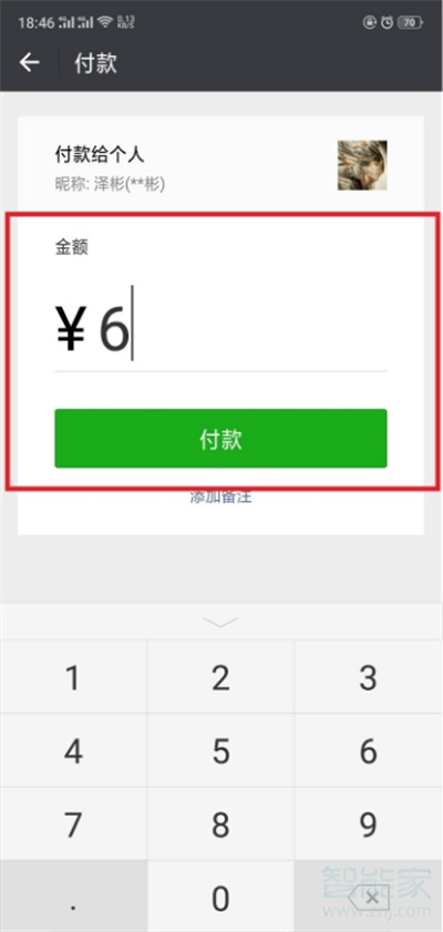 3.输入付款金额,如果你要付“6”元,输入数字“6”点击付款。
