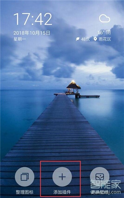 3、选择自己需要添加的桌面插件,以墨迹天气为例,长按拖动到主屏幕的空白区域即可。