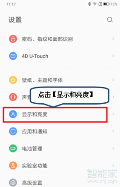 2、滑动菜单选项,找到并且点击【显示和亮度】。