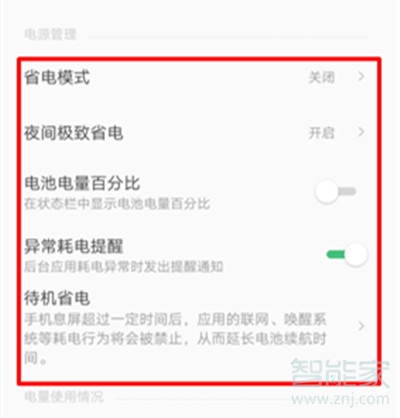 3、可开启【省电模式】、【夜间极致省电】、【电池电量百分比】、【异常耗电提醒】及【待机省电】。