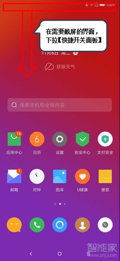 1、打开需要截屏的页面,然后从顶部下拉,调出顶部菜单栏。