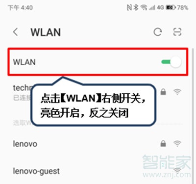 3、点击【WLAN】右侧开关,亮色开启,反之关闭。
