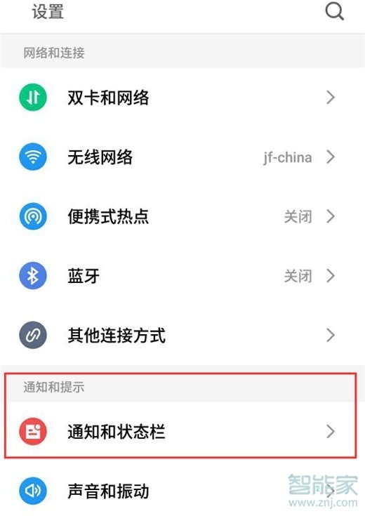 2、进入设置之后,找到并点击【通知与状态栏】选项。