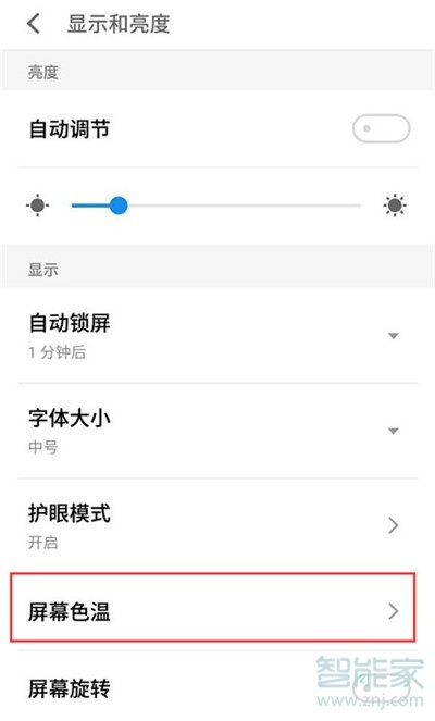 3、在显示和亮度界面,找到【屏幕色温】选项,点击进入。