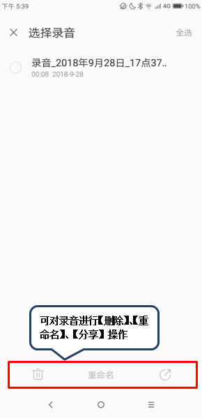 4、点击右上角【菜单列表】可查看录音文件,点击右上角【编辑】图标,可对录音文件进行【删除】、【重命名】和【分享】操作。