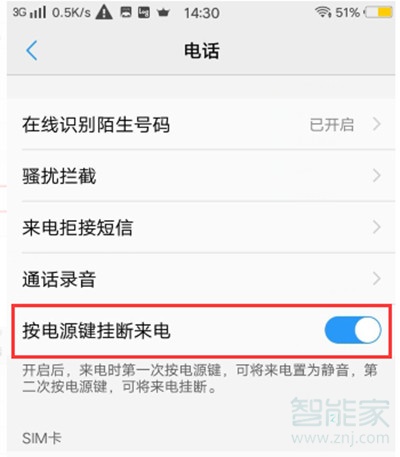 4.电话页面之后,下面有一个按电源键挂断来电,将这个功能键打开就可以啦。