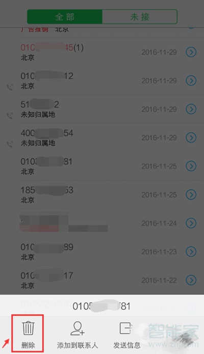 第五步,在全部通话记录中,找到要删除的通话记录,长按该通话记录。