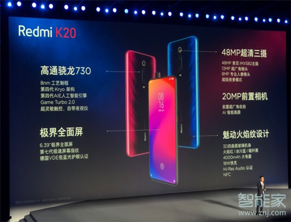 红米k20采用魅动火焰纹设计,3D四曲面玻璃机身,拥有火焰红、冰川蓝、碳纤黑三种配色,配备4000mAh容量电池,支持18W快充和NFC,通过Hi-Res Audio认证。