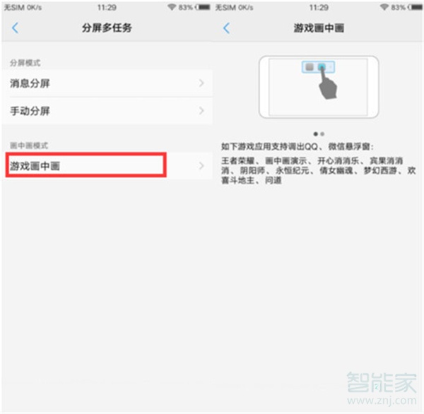 2.进入【分屏多任务】点击【游戏画中画】设置进入,即可在【游戏画中画】界面查看到支持的程序及操作方法。