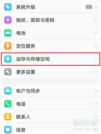 2.进入设置界面之后下来,找到【运存与储存空间】,点击打开。