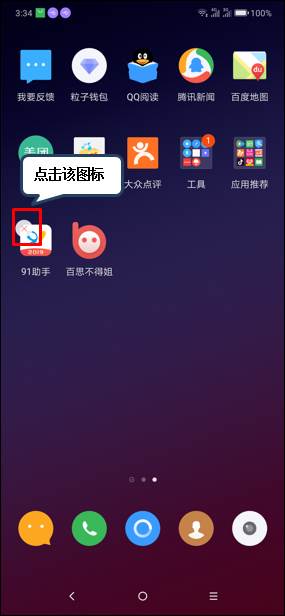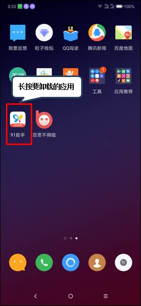 1、在【待机界面】长按要卸载的应用软件,如【91助手】。