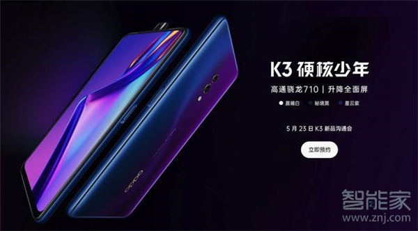 OPPO公布K系列最新产品K3 OPPOK3搭载高通骁龙710处理器、光棱升降摄像头、UFS2.1高速闪存和光感屏幕指纹2.0等硬核配置。其中升降摄像头通过了20万次的升降测试,升起或下降一次的时间只需要0.74秒。正面是一块6.5英寸无刘海全景屏,屏占比达到了91.1%。在游戏方面搭载了HyperBoost 2.0加速技术,TouchBoost、FrameBoost、LinkBoost三大黑科技为K3提供畅快的游戏体验。
