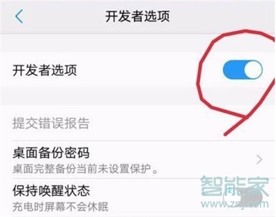 第三步:进入【开发者选项】详情页面,打开【开发者选项】右侧滑动条,使其显示为蓝色;