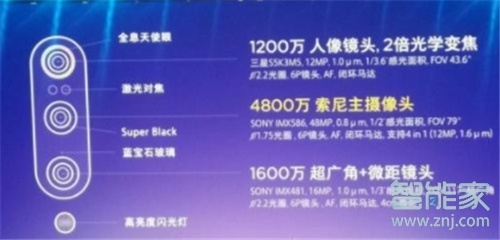 1.4800万索尼主摄像头。SONY IMX586, 48MP, 0.8μm, 1/2"感光面积, FOV 79°。f/1.75光圈 , 6P镜头, AF, 闭环马达, 支持4 in 1 (12MP, 1.6μm)。