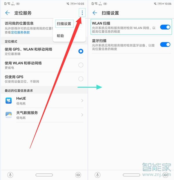 2.然后我们点击打开【定位服务】目录右上方三个点的图标,点击里面的【扫描设置】,打开【WLAN扫描】