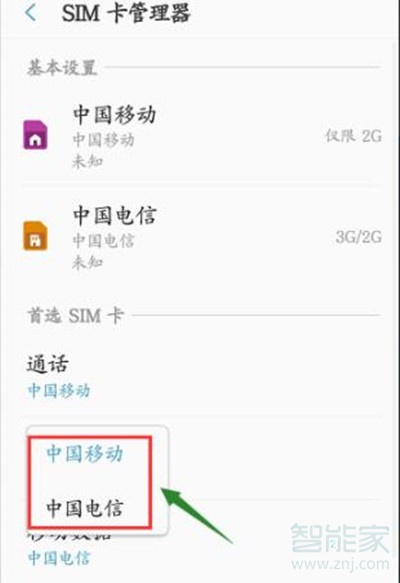 5、我们首先点击通话下面的运营商,可以选择两张卡的任意一个运营商,如下图所示,